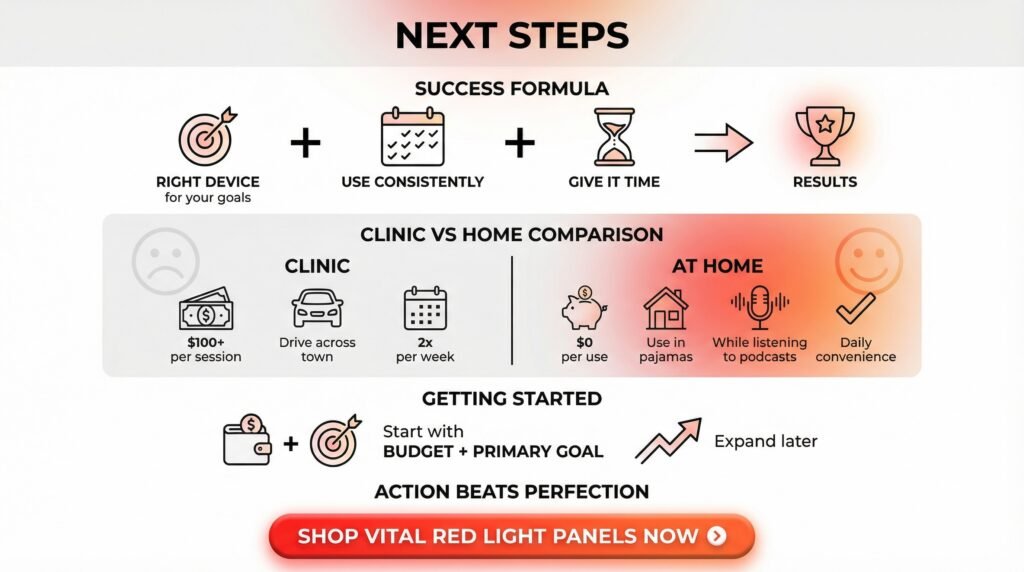 Devices provide solid irradiance (≥100 mW/cm²), require consistent 10-20 minute sessions at 6-12 inches, and show gradual results in 4-6+ weeks with minimal risks. Vitals’ devices are great for those committed to seeking convenient, effective at-home therapy, emphasizing starting simple, tracking progress, and prioritizing consistency over chasing the “perfect” device.