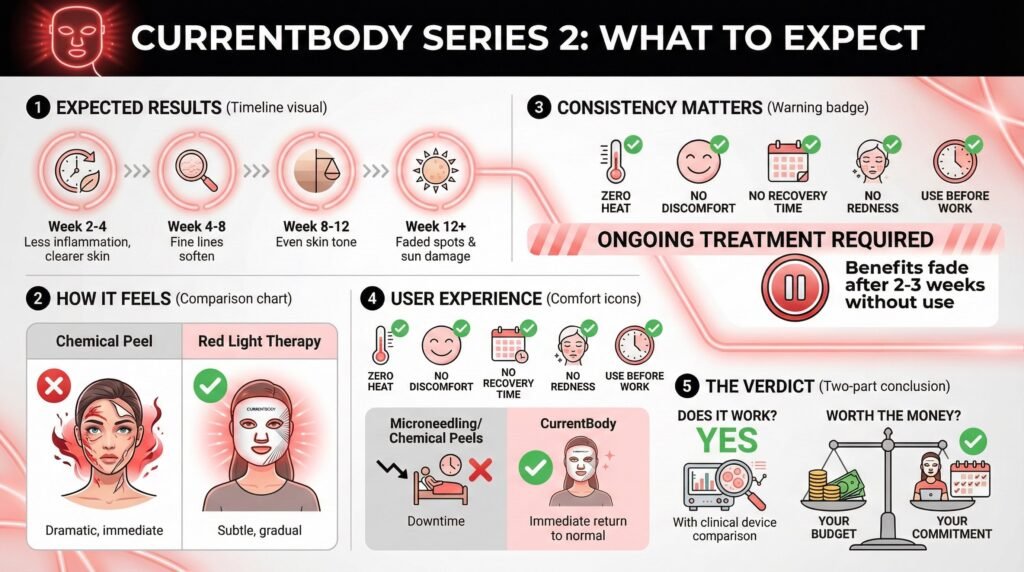 The CurrentBody Series 2 is a solid mid-range LED mask that delivers on its claims when used consistently. It’s not the cheapest option, and it’s not professional-grade clinic equipment.