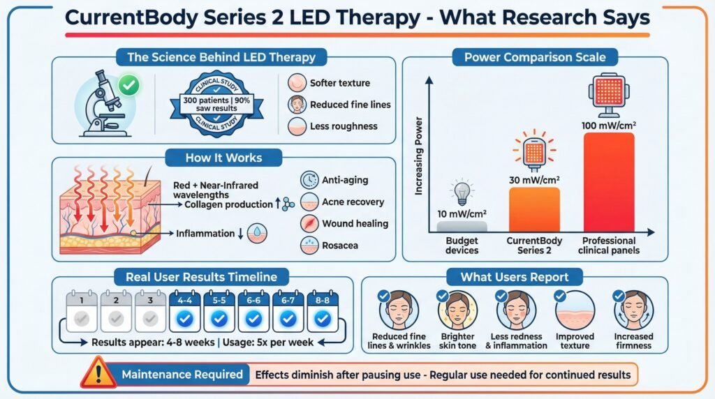 LED light therapy itself has solid research backing it up in dermatology. A clinical study with 300 patients using LED therapy showed that 90% reported softer skin texture and reduction in roughness and fine lines.