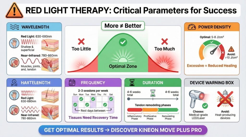 Treatment parameters matter enormously. Wavelengths should be 630 to 860 nm, depending on tendon depth; power density should stay between 5 and 8 joules per square centimeter, and frequency should be 2 to 3 sessions weekly over 4 to 6 weeks.