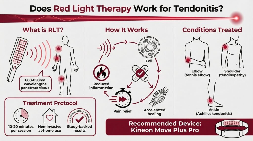 Red light therapy for tendonitis shows modest promise for reducing pain during early-stage recovery when pain limits rehabilitation efforts. The biological mechanisms are legitimate, involving mitochondrial stimulation, improved circulation, inflammatory modulation, and collagen production support.