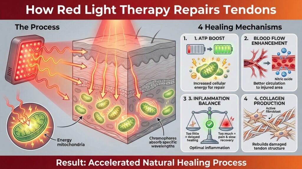 The mechanism that makes red light therapy potentially effective for tendonitis is actually pretty well understood at the cellular level. Your cells contain mitochondria, which function as tiny power plants generating ATP.