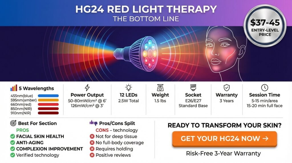 For anyone focused on facial red light therapy who wants to test the technology without a massive investment, the HG24 is worth checking out. Five wavelengths with verified power output for under $50 doesn’t exist anywhere else.