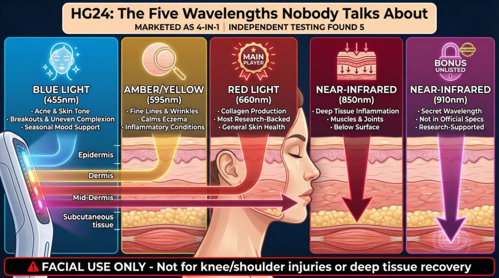- The Five Wavelengths Nobody Talks About – Breakdown of the four advertised wavelengths plus a fifth discovered via testing (blue for acne, amber for wrinkles, red for collagen, NIR for deeper benefits).