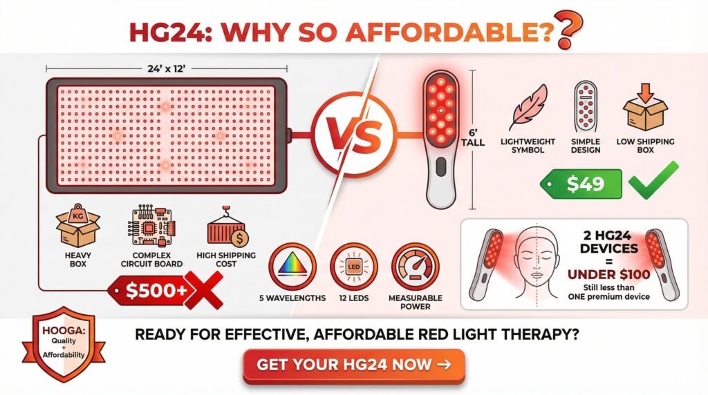 How does it compare to expensive devices? It has less coverage/power than $300+ panels but delivers comparable wavelengths and verified output for facial use at a fraction of the cost (e.g., two HG24s < $100 vs. one high-end panel).