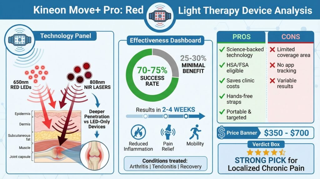 The Kineon Move+ Pro represents legitimate therapeutic technology backed by established photobiomodulation science. The laser-LED combination provides genuine advantages over LED-only devices for reaching deeper tissue structures where many chronic pain conditions originate.