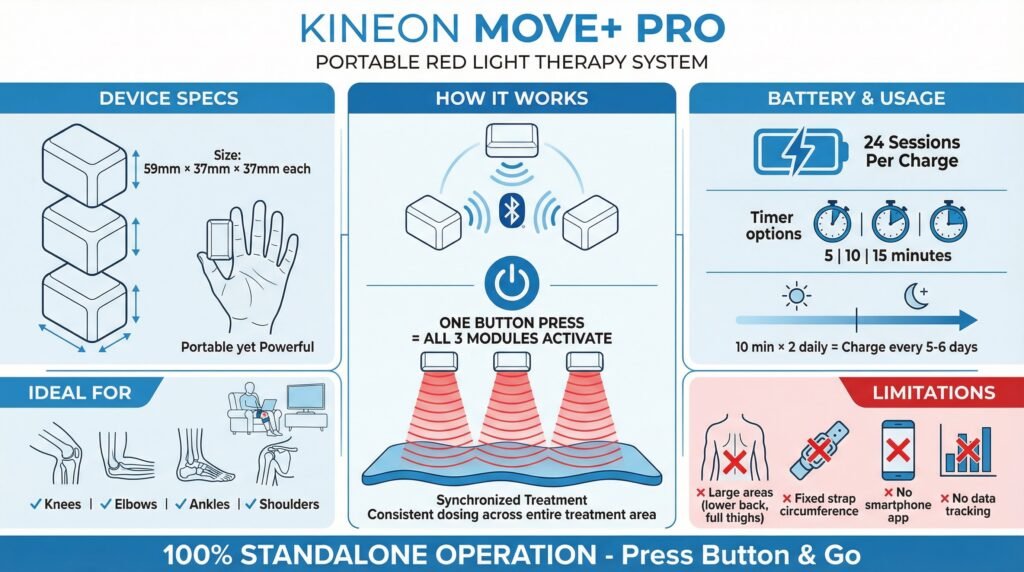 The Kineon Move+ Pro is a portable red light therapy device using 650nm LEDs + 808nm near-infrared lasers for deeper joint/muscle penetration than typical LED-only units.