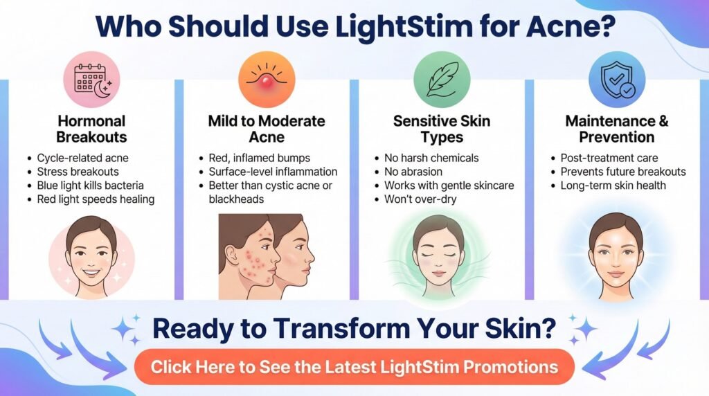 The LightStim for acne device works well for what it’s designed to do: treat mild to moderate inflammatory acne with a gentle, non-invasive method that you can use at home. It won’t replace dermatologist care for severe acne, and it needs consistent use for several weeks before you see results.