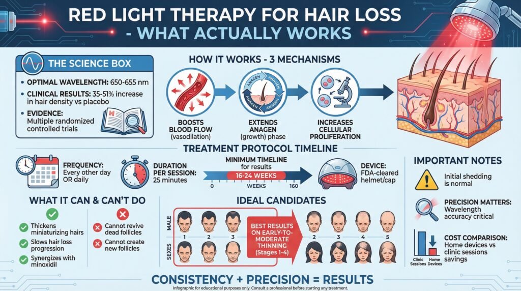 Red light therapy for hair loss has been validated by multiple randomized controlled trials showing 35-51% improvements over placebo when using 650-655 nm wavelength devices for 16-24 weeks with consistent every-other-day or daily use.