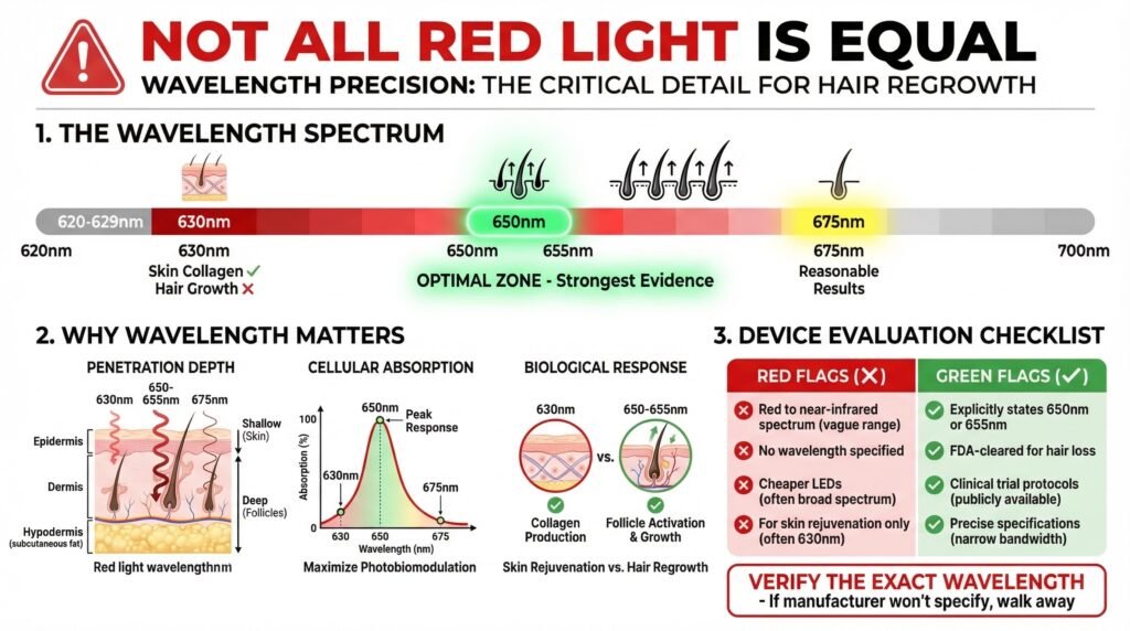 You can’t just buy a red LED panel marketed for skin rejuvenation and expect hair regrowth results. Different wavelengths penetrate to different depths and trigger different cellular responses.