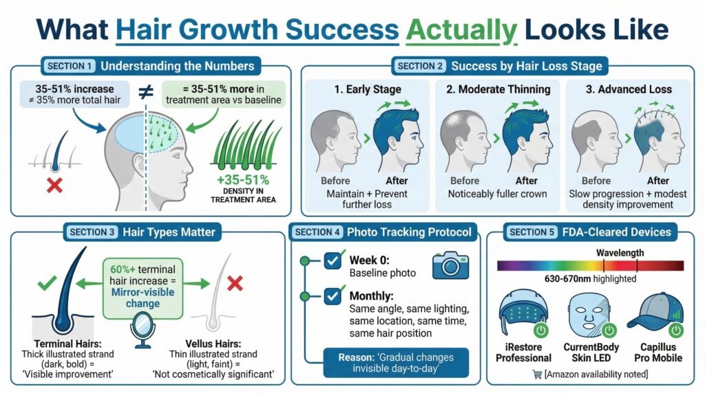 · What Success Actually Looks Like: Realistic expectations (fuller appearance in moderate thinning, maintenance in early stages); tracking progress with photos; focus on terminal hair increases.