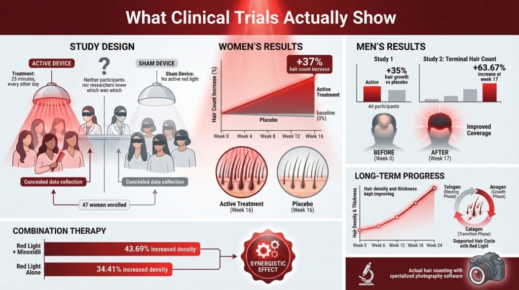A multicenter randomized controlled trial enrolled 47 women with early-stage female pattern baldness. Half used an active red light device, half used an identical-looking sham device.