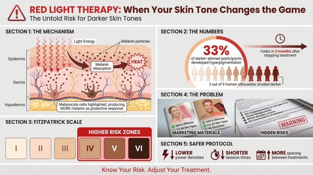 What frustrates me is that most marketing materials show red light therapy working beautifully on fair-skinned models, and the specific risks for darker skin get buried in the fine print or clinical papers that most consumers never read.
