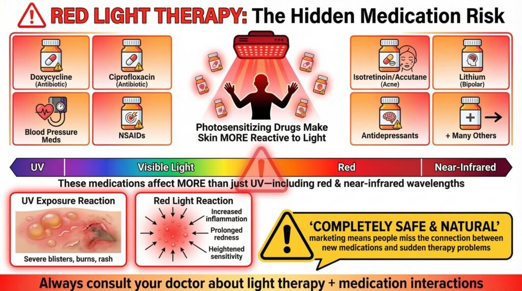 Here’s something that genuinely concerns me about how casually red light therapy is marketed: the lack of clear information about medication interactions.