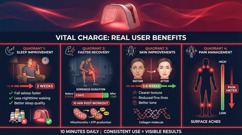 What benefits can I expect and how long until results? Improved sleep (faster onset, fewer wakings in 1-2 weeks), quicker muscle recovery/reduced soreness (2-3 weeks), better skin texture/tone (3-6 weeks), and surface-level pain relief. Benefits are gradual and require consistent daily/near-daily 10-minute sessions.
