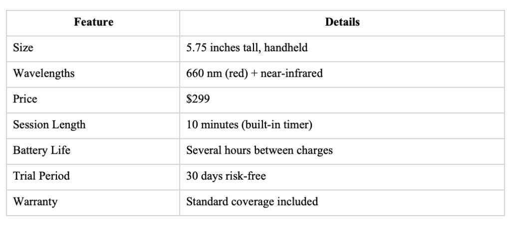 The Vital Charge is a compact, battery-powered handheld red light therapy device ($299) delivering 660nm red and near-infrared light for skin health, muscle recovery, sleep improvement, and general wellness. It’s highly portable (cordless, travel-friendly, 5.75 inches tall) with a 10-minute auto-timer, FDA-approved, and stays cool during use.