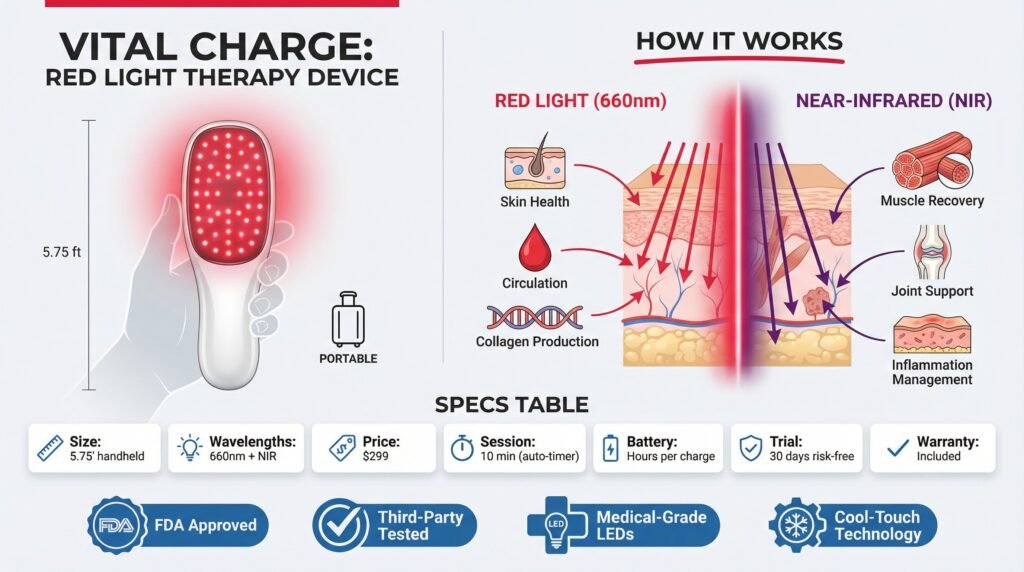 What is the Vital Charge 2026? A portable, handheld red light therapy device using medical-grade LEDs at 660nm red and near-infrared wavelengths to support skin health, recovery, sleep, and cellular function.