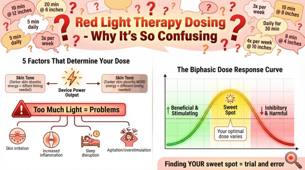 • Dosing Is Way More Complicated Than Anyone Admits — Wide protocol variation, biphasic response (too much can harm), factors like device power/skin tone, and overexposure symptoms (irritation, inflammation, sleep issues)