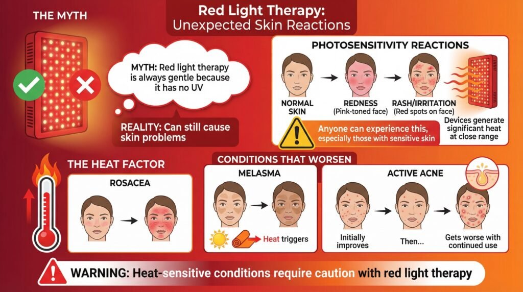 Yes, red light therapy can cause skin reactions in some people, including redness, irritation, rashes, and worsening of conditions like rosacea and melasma. The heat generated by devices can trigger problems, especially for people with heat-sensitive skin conditions.